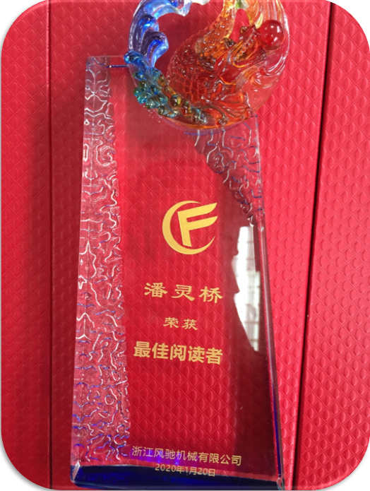通過對四個季度最佳及優(yōu)秀心得匯總,經(jīng)公司領(lǐng)導層最終評選生產(chǎn)部潘靈橋為2019年度“最佳閱讀者”,并授予該榮譽獎杯。