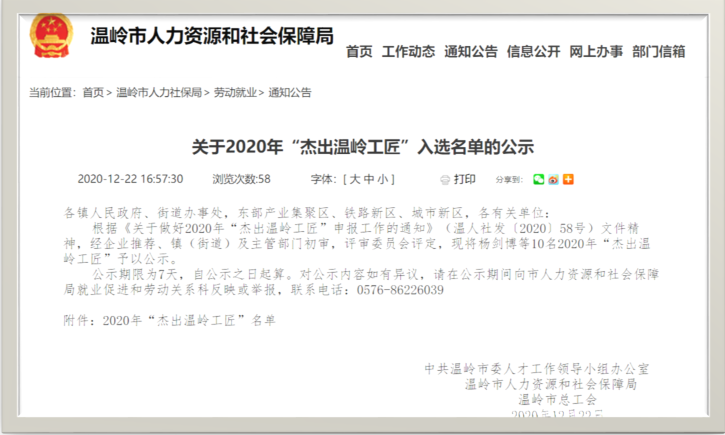 公司員工莫朝陽(yáng)入選為“杰出溫嶺工匠”