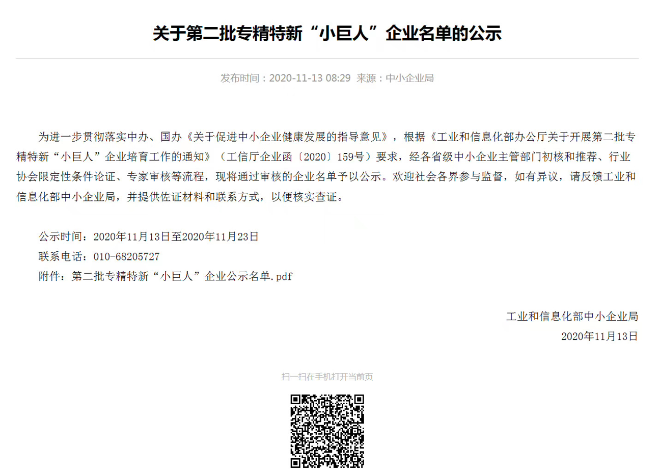 根據(jù)《關(guān)于組織推薦第二批國(guó)家級(jí)專(zhuān)精特新“小巨人”企業(yè)》文件通知要求,我司通過(guò)地方經(jīng)信推薦,符合申報(bào)要求,積極準(zhǔn)備相關(guān)資料上報(bào),經(jīng)各地經(jīng)信部門(mén)初審、市級(jí)相關(guān)部門(mén)會(huì)審以及省級(jí)專(zhuān)家評(píng)審,我司順利通過(guò)評(píng)審,成功入選“國(guó)家級(jí)專(zhuān)精特新“小巨人”名單,取得國(guó)家級(jí)榮譽(yù),并在工信部平臺(tái)上予以公布。