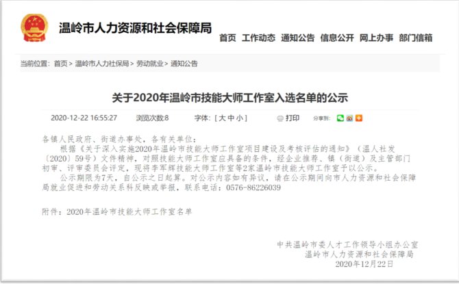 我司根據(jù)《關(guān)于深入實(shí)施2020年度溫嶺市技能大師工作室項(xiàng)目建設(shè)及考核評(píng)估的通知》(溫人社發(fā)〔2020〕59號(hào))文件精神,通過(guò)自行推薦以及地方政府的大力支持,充分準(zhǔn)備了相關(guān)申報(bào)資料,通過(guò)主管部門(mén)的初審以及專(zhuān)家的評(píng)審、部門(mén)審議和社會(huì)公示等評(píng)選環(huán)節(jié),我司最終順利通過(guò)評(píng)審,被評(píng)定為“李軍輝技能大師工作室”并于政府平臺(tái)公示。